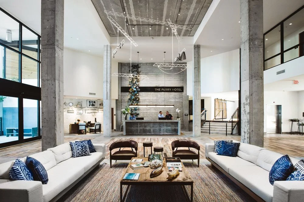 The Perry Hotel Key West, located in Stock Island, is a true celebration of the island's rich history and working-class roots. Inspired by the hardworking fishermen and craftsmen who once defined Stock Island, the hotel’s design evokes the transformation of a warehouse into a modern, welcoming space. Casa Conde's team meticulously crafted the space planning and full design of the guest rooms, blending industrial elements like raw steel, exposed beams, and concrete floors with warm, natural textures such as reclaimed wood and soft textiles. This thoughtful fusion creates an environment that feels both rugged and refined, capturing the essence of Stock Island’s maritime heritage while offering guests a serene and inviting retreat